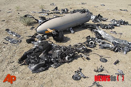 【테헤란=AP/뉴시스】이란 혁명수비대가 25일(현지시간) 핵시설 인근에서 격추했다고 주장하면서 공개한 이스라엘 무인항공기의 잔해 사진.  2014.08.26
