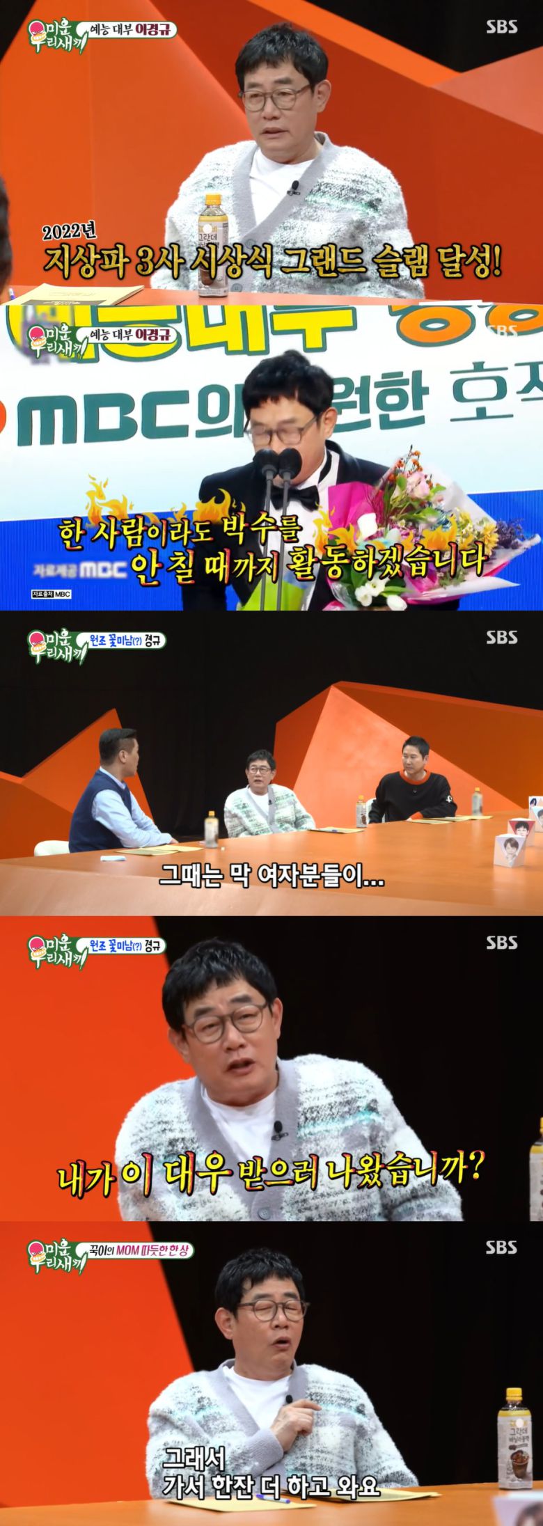 이경규가 등장하자 신동엽과 서장훈은 기립 박수를 하며 맞이했다. 이경규는 지난해 지상파 3사 시상식에서 모두 상을 받았다. 이경규는 "큰 그림이다. 2023년에 세 군데 다 하겠다는 것"이라며 웃었다. SBS에서는 '베스트 캐릭터 상'을 받았는데 이경규는 "그건 매년 제가 받을 것이다. 왜냐면 제가 성격이 계속 더러워지고 있다. 10년은 제가 받는다"고 확신했다.
