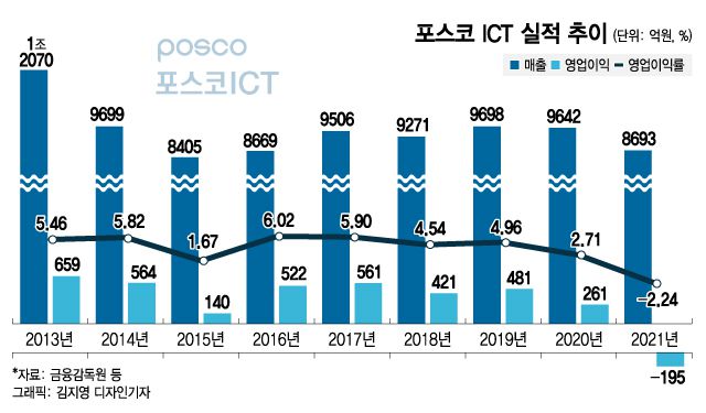 2011년부터 2013년까지 3년 연속으로 포스코 ICT는 매출규모를 1조2000억원대까지 키우며 성장세를 구가했지만 이후 2021년까지는 줄곧 8000억~9000억원대 수준에 머물렀다. 매출액 대비 영업이익률도 5~6%대에서 2020년 2.71%로 고꾸라졌다.