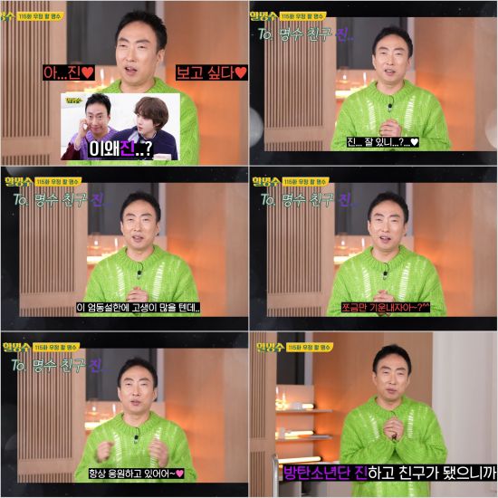 (엑스포츠뉴스 이정범 기자) 방탄소년단(BTS) 진을 향해 박명수가 진심이 담긴 응원을 보내 시선을 끈다.