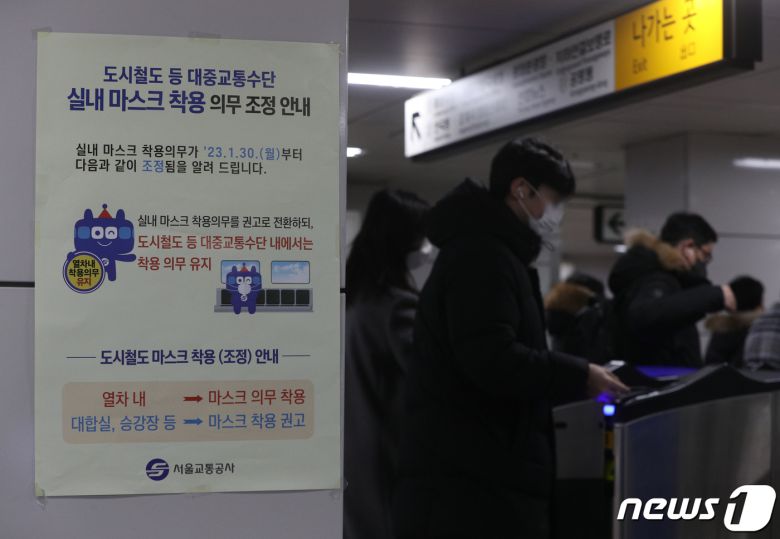 실내 마스크 착용 의무가 해제된 30일 서울 종각역에 실내 마스크 착용 의무 조정 안내문이 붙어 있다. 2023.1.30/뉴스1 ⓒ News1 신웅수 기자