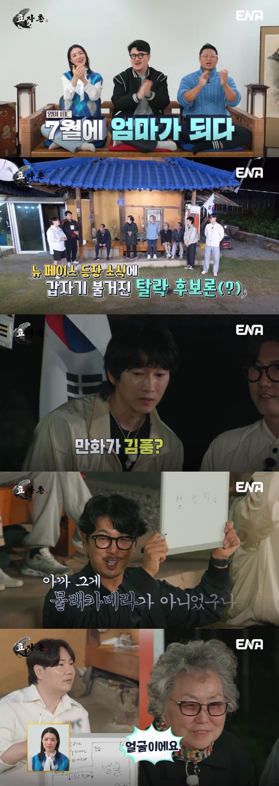 잠시 후, 김부용 모자의 등장으로 긴장감이 폭발한 효자촌의 모습이 펼쳐졌다. '뉴페이스' 김부용을 확인한 신성은 "만화가 김풍 아니냐"고 물어 폭소를 안긴 한편, "누군가는 바뀔 것 같다"며 '효자촌 탈락설'에 불을 지폈다.