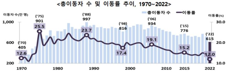인구 100명당 이동자 수를 뜻하는 인구이동률은 작년 12.0%로 1972년(11.0%) 이후 최저치였다.