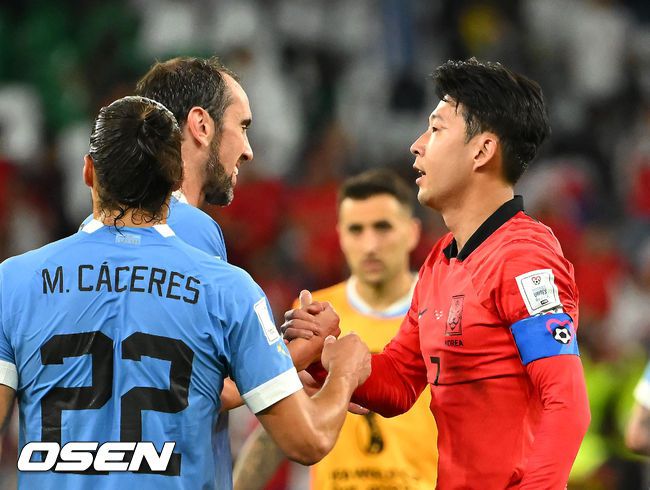 [OSEN=도하(카타르), 박준형 기자] 파울루 벤투 감독이 이끄는 축구대표팀은 24일 카타르 알 라이얀에 위치한 에듀케이션시티 스타디움에서 우루과이를 상대로 ‘카타르 월드컵 2022 H조 조별리그 1차전’에서 0-0 무승부를 기록했다. 한국은 2010년 남아공 월드컵 이후 12년 만에 16강 진출에 도전한다.경기 종료 후 한국 손흥민이 우루과이 고딘과 인사를 나누고 있다. 2022.11.24 /soul1014@osen.co.kr |
