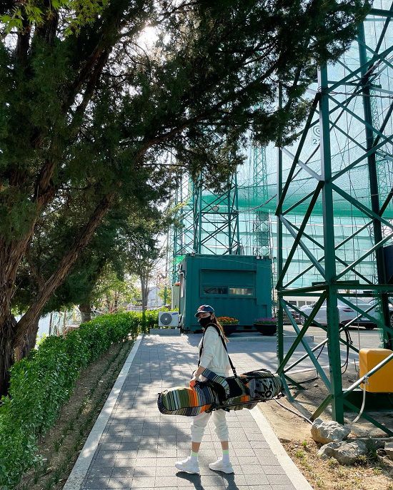 공개된 사진 속 송가인은 몸만한 골프채 가방을 어깨에 메고 카메라를 응시하고 있다.