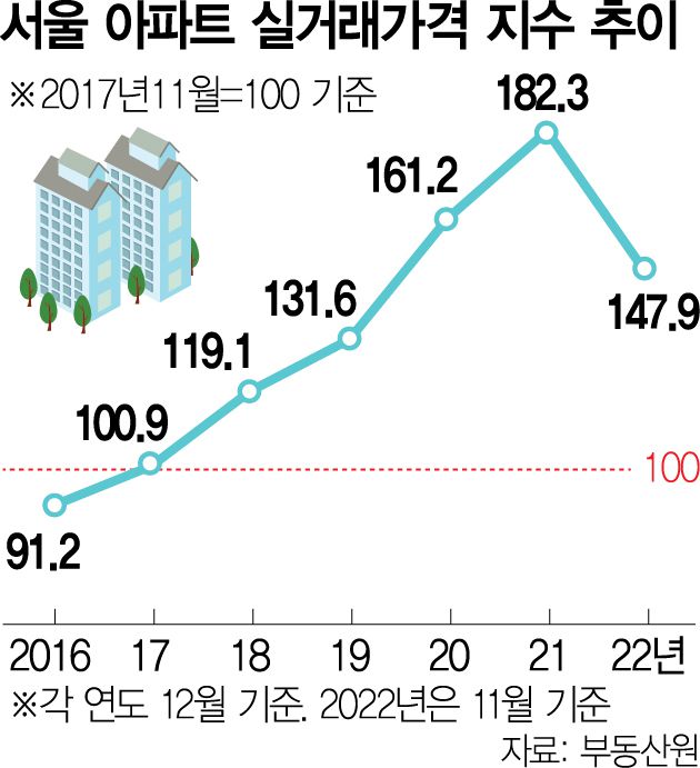 △연말 기준금리가 현행 3.5% 수준을 유지한다면 올해 30%가량 떨어진다고 본다. 낙폭보다 과거 어느 수준으로 가격이 회귀하느냐가 더 중요하다. 서울 아파트 가격은 올해 말 기준으로 5년 전인 2018년 4분기 수준까지 밀릴 것으로 예상한다.