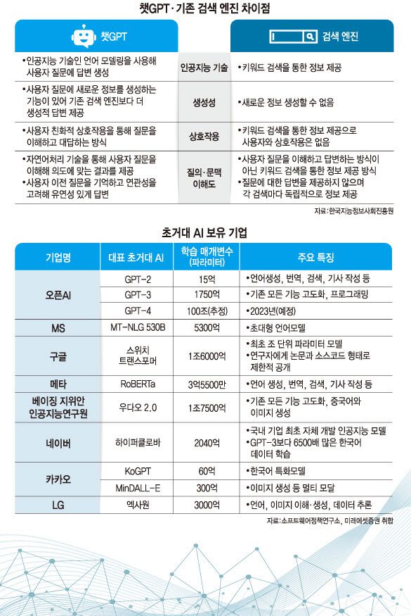 챗GPT를 개발한 오픈AI뿐만 아니라 구글, MS 등 글로벌 기업은 수년 전부터 생성 AI 분야에 대대적 투자를 진행 중이다. 우리나라도 SK텔레콤, KT, LG유플러스 등 통신3사를 비롯해 네이버, 카카오 등 플랫폼 사업자와 LG 등에서 챗GPT를 따라잡는 생성 AI 기술 개발에 집중한다.
