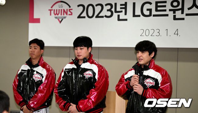 [OSEN=잠실, 최규한 기자] LG 유니폼을 입은 김유영, 윤호솔, 박동원(왼쪽부터)이 인사말을 전하고 있다. 2023.01.04 / dreamer@osen.co.kr