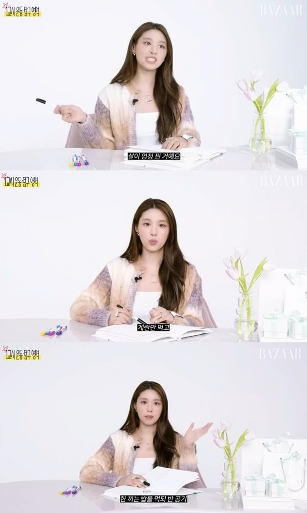 날씬한 몸매 유지법으로는 "노력"이라고 말했다. 그는 "어릴때는 맨날 짜장면 먹고 떡볶이 먹어도 안쪘다. 근데 점점 찌더라. 얼마전에 휴가를 갔다왔는데 살이 엄청 찐거다. 와서 이 화보 전까지 고구마랑 닭가슴살이랑 계란만 먹고, 사실 그것만 먹진 않고 하루에 한끼는 무조건 고구마나 닭가슴살 같은걸 먹고 한끼는 밥을 먹되 반공기. 어제 헬스장 대표님한테 적당히 하면서 살 뺄수 있는 방법은 없냐 꼭 죽도록 해야되냐고 물었는데 죽도록 해야한다고 했다"고 털어놨다.
