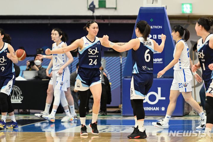[서울=뉴시스]안경남 기자 = 여자프로농구 인천 신한은행이 아산 우리은행을 잡고 공동 3위가 됐다.