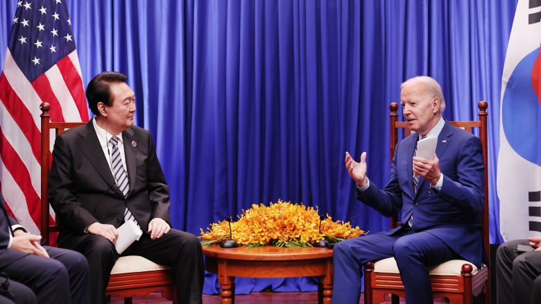 윤석열 대통령과 조 바이든 미국 대통령이 지난해 11월 캄보디아 프놈펜의 한 호텔에서 한미 정상회담을 하고 있다. 윤 대통령은 여기서 한국도 미국이 주도하는 '푸른 태평양 동반자(PBP)' 협정에 참석하겠다는 뜻을 밝혔다. /뉴스1