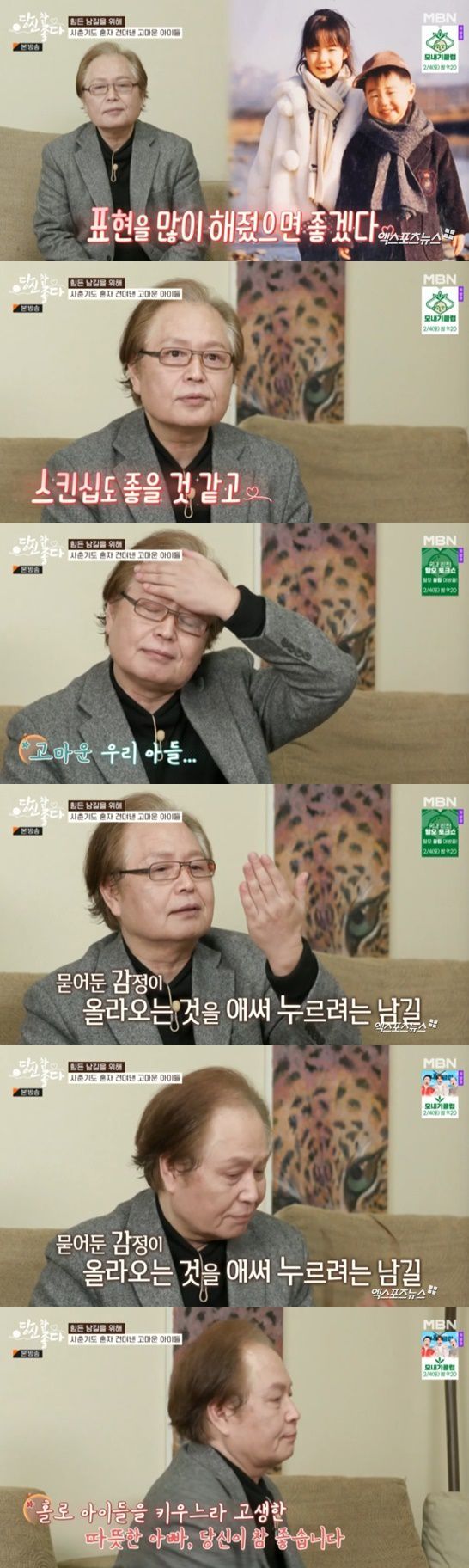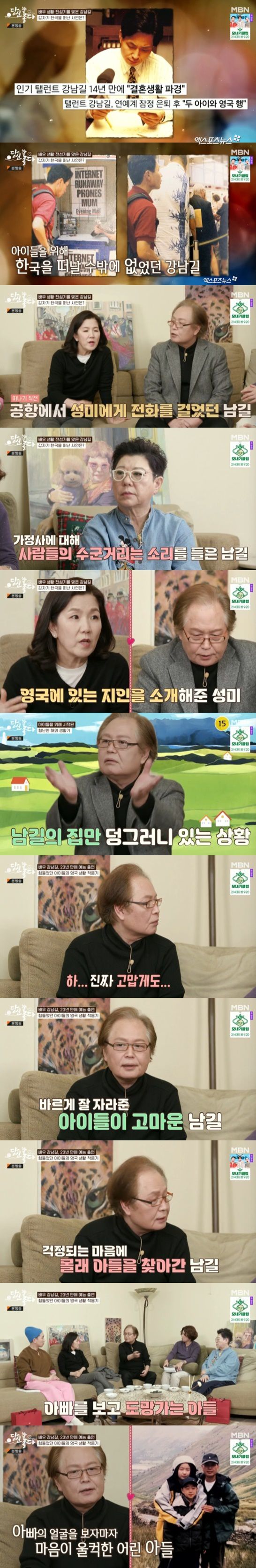 강남길은 "항상 해주고 싶은 게 좀 더 사랑한다는 표현이다. 스킨십도 좋을 것 같고 서로 간에 칭찬하는 게 부족했다. 우리 아들이 다음부터는 아빠에게 표현을 많이 해줬으면 한다. 나도 아들에게 표현을 많이 못 했는데 앞으로 서로 마음을 표현했으면 한다. 우리 아들 사랑하고 고맙다. 애들 얘기만 나오면 눈물이 나온다"라며 눈물을 흘렸다.