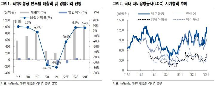정연승 NH투자증권 연구원은 "목표주가는 올해 주당순이익(EPS)에서 글로벌 저비용항공사(LCC) 목표 주가수익비율(PER) 13배를 적용해 하향 조정했다"면서 "올해 1분기부터 흑자전환이 예상되나 현 주가는 높아진 기대감을 충분히 반영한 수준"이라고 판단했다.