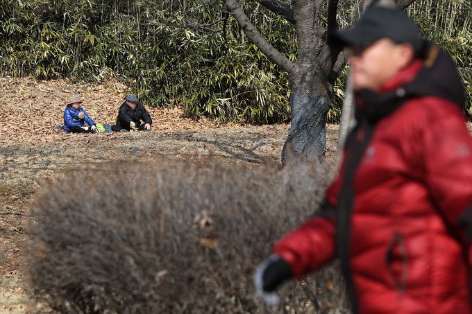 오전과 비교해 비교적 포근한 날씨를 보인 지난 29일 오후 서울 송파구 올림픽공원에서 어르신 두 분이 잔디에 앉아 휴식을 취하고 있다.    뉴시스