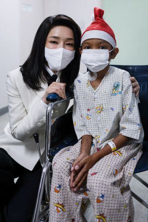 윤석열 대통령 부인 김건희 여사가 지난달 21일 서울 송파구 서울아산병원에서 심장질환 수술을 받고 회복 중인 캄보디아 아동 로타 군을 만나 기념촬영하고 있다. (사진=뉴시스) |