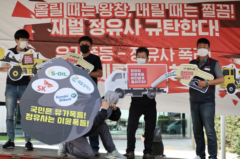 지난해 7월25일 민주노총 양경수 위원장 등 관계자들이 서울 강남구 역삼동 지에스(GS)칼텍스 본사 앞에서 재벌 정유사의 폭리 행태를 규탄하고, 정부에 ‘횡재세' 도입을 촉구하는 기자회견을 하며 퍼포먼스를 하고 있다. 연합뉴스
