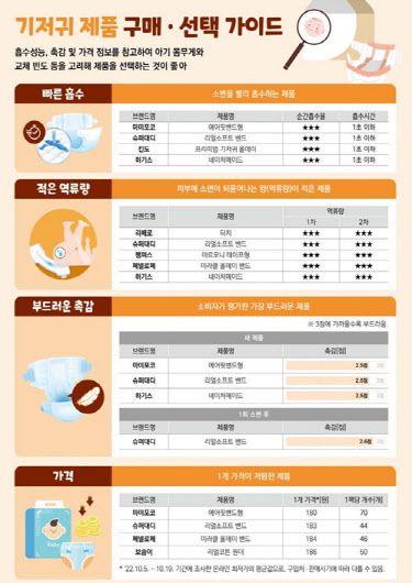 [세종=이데일리 강신우 기자] 한국소비자원이 육아 필수품인 신생아 일회용 기저귀(밴드형) 10개 제품을 비교·평가한 결과 성능과 가격 등에서 제품 간 차이를 보인 것으로 나타났다고 31일 밝혔다.
