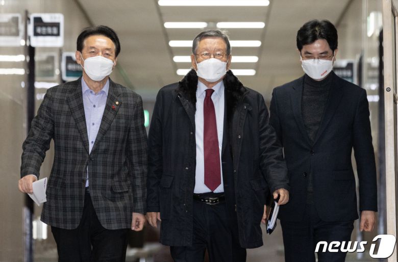 유흥수 국민의힘 선거관리위원장(가운데)과 김석기 부위원장(왼쪽). 2023.1.3/뉴스1 ⓒ News1 이재명 기자