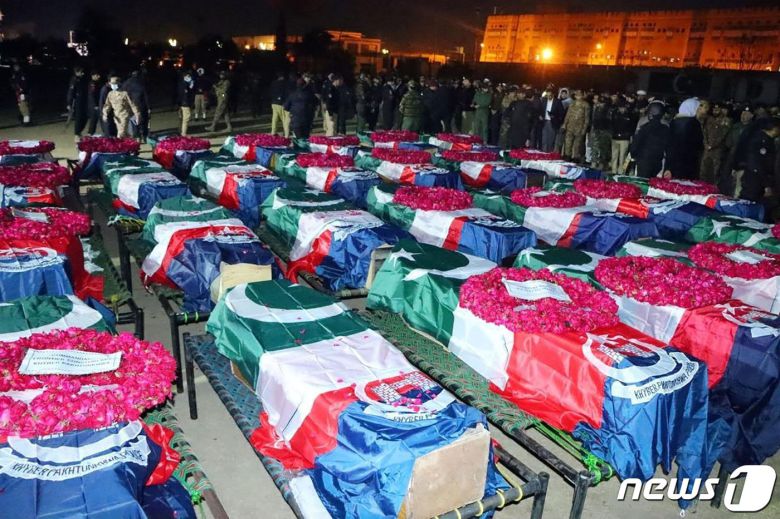 30일(현지시간) 파키스탄 페샤와르 경찰 단지 내의 이슬람 사원에서 폭탄 공격이 발생해 60여명의 사망자가 발생했다. 사망한 경찰관들의 시신은 파키스탄 국기로 장식된 관에 안치됐다. ⓒ AFP=뉴스1 ⓒ News1 강민경 기자 |