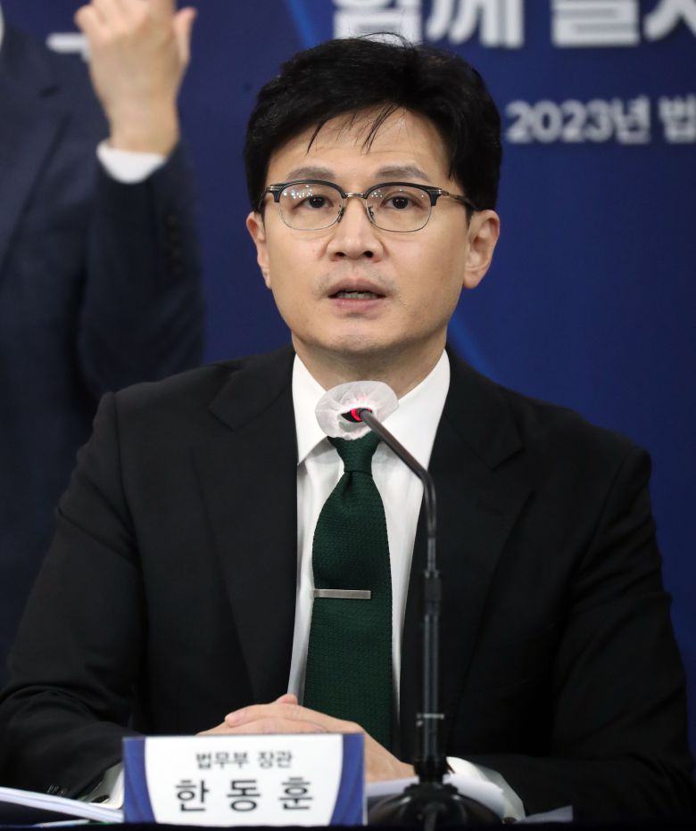 한동훈 법무부 장관이 지난 26일 오후 서울 종로구 세종대로 정부서울청사에서 2023년 업무계획보고 브리핑을 하고 있다./뉴스1