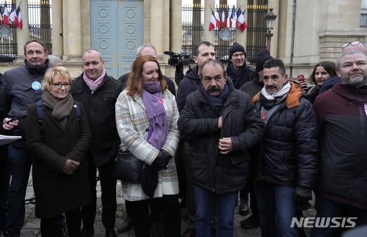 [파리=AP/뉴시스] 지난 25일(현지시간) 프랑스 파리의 국회 밖에서 노조 지도자들이 기자회견하고 있다. 지난주 파리를 비롯한 여러 도시에서 최소 110만 명이 정년 연장 계획에 반대하는 전국적인 파업을 벌였으나 에마뉘엘 마크롱 대통령은 연금 개혁을 강행할 것이라고 밝혔다. 프랑스 노조는 오는 31일 새로운 파업과 시위를 벌인다고 발표했다. 2023.01.31. |
