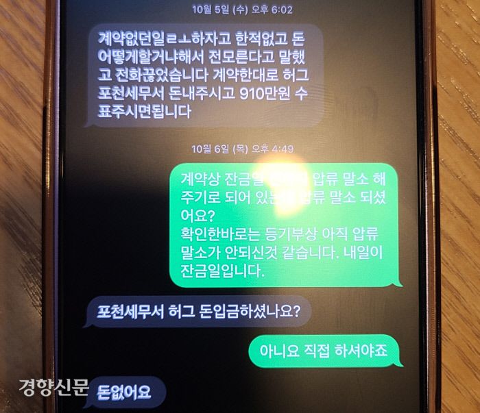 박씨는 “담당 공무원은 ‘김씨가 세금을 조금씩이라도 내고 있으니 의지가 있는 것 아니겠냐’고 했지만, 그 세금은 피해자들이 대신 갚아준 것”이라며 “그 말을 듣는 순간 ‘나랏밥 먹는 사람들은 이 피해를 10년, 20년 뒤에도 막을 수 없겠다’ 생각했다”고 말했다. 체념한 박씨는 결국 김씨에게 매매계약을 체결하고 싶다는 의사를 밝혔다. 이를 위해 체납 세금을 납부해 세무서와 HUG가 걸어둔 압류를 풀어줄 것을 요구했다. 그러자 김씨는 ‘세무서와 HUG에 직접 돈을 내고 압류를 푼 뒤, 910만원을 현금으로 보내라’는 조건을 일방 통보했다. 박씨가 거부하자 김씨는 “돈 없다”는 말을 남기고 연락을 끊었다.