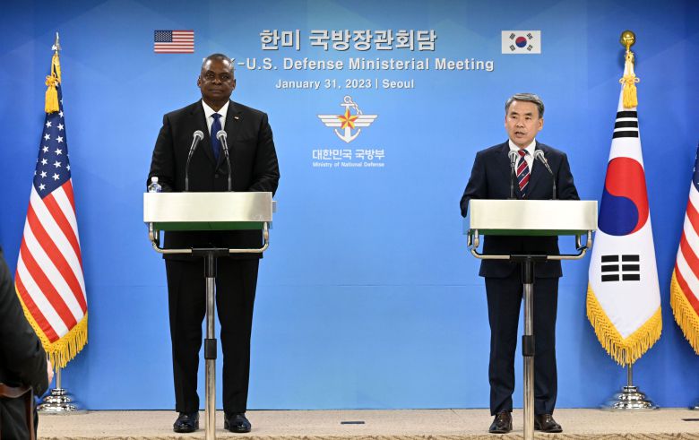 이종섭 국방부 장관(오른쪽)과 로이드 오스틴 미국 국방장관. 2023.1.31/뉴스1 ⓒ News1 사진공동취재단