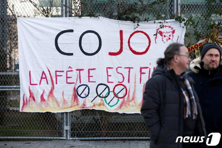 지난달 11일(현지시간) 프랑스 파리 인근 생드니에 있는 2024년 파리 올림픽위원회 본부 앞에서 올림픽을 반대하는 단체가 시위를 벌이고 있다. ⓒ 로이터=뉴스1 ⓒ News1 최종일 기자 |
