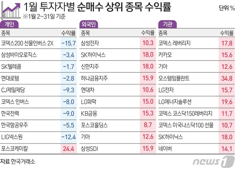 (서울=뉴스1) 손엄지 기자 = 1월 주가 하락에 베팅한 개미(개인투자자)는 마이너스 성적표를 떠안았다. 반면 외인과 기관은 '1월 효과'를 톡톡히 누리며 두 자릿수 수익률을 기록했다.