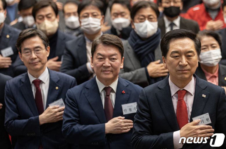 국민의힘 당권주자인 조경태(왼쪽부터), 안철수, 김기현 의원이 15일 오후 서울 양천구 해누리타운에서 열린 양천갑 당원대회에서 국민의례를 하고 있다. 2023.1.15/뉴스1 ⓒ News1 이재명 기자