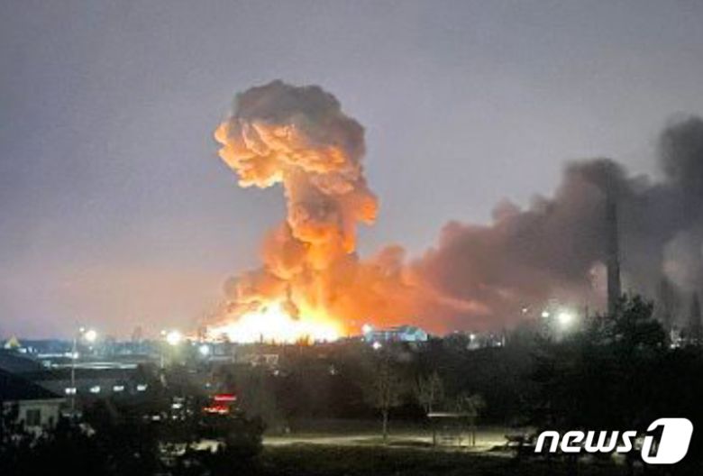블라디미르 푸틴 러시아 대통령이 우크라이나 침공을 공식화하면서 곳곳에서 포성과 폭발이 잇따랐다. 사진은 지난해 2월24일(현지시간) 폭격에 인한 폭발로 불타고 있는 우크라이나 수도 키이우 일대.(우크라이나 대통령실 제공)2022.2.24/뉴스1 |