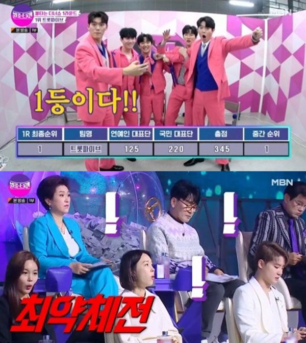 이날 방송에선 3차 미션 무대가 펼쳐져 1라운드에선 트롯파이브가 1위를 차지했다. 뒤를 이어 뽕형제가 2위를 차지, 뽕형제, 오룡이 나르샤가 공동 3위, 뽕발라 5위를 차지했다.
