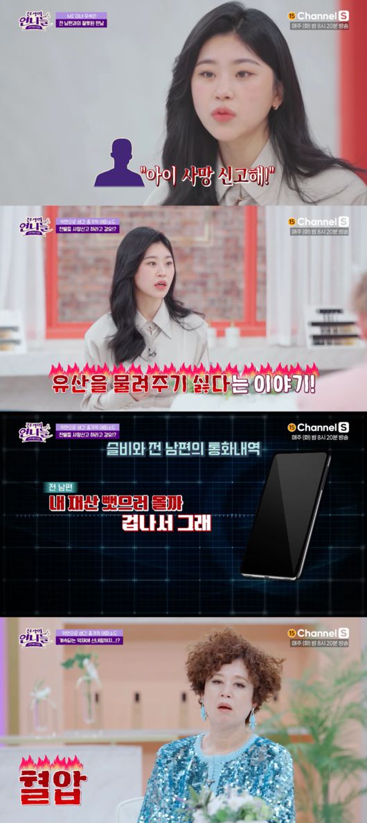 사연자는 “얼마 전에 전 남편이 전화가 와서 제 딸을 사망신고하라더라. 자기 재산을 물려주기 싫으니깐 사망신고를 하라더라”며 녹취를 공개했다. 녹취 속 전 남편은 “네 애가 나중에 자라서 내 재산을 뺏으러 올까봐 겁난다. 호적에서 지워”라고 말하기도.