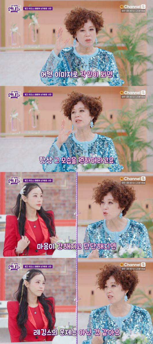 이를 들은 박미선은 “어떤 이미지로 각인되면, 항상 그 이미지를 원하더라. 대중이 원하는 모습을 보여줘야 되나? 사람들이 원하면 해야 하나?”라고 의아함을 드러냈고, 김호영은 “행사장에서 레깅스 입고 부르는 노래는 하고! 아닌 모습도 보여줄 필요가 있다”고 조언했다. 또한 박미선은 “마음이 강해지고 단단해지면, 레깅스를 입고 말고의 문제는 아닌 것 같다”고 말했다.