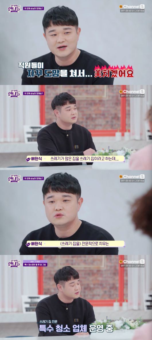 이어 등장한 손님은 작은 사업체를 운영하는 33살 대표로, 직원들이 자꾸 도망쳐 고민이라고. 그는 “저는 쓰레기집이라고. 쓰레기가 많은 집을 쓰레기 집이라고 하는데, 그런 걸 전문적으로 청소해주는 업체다. 많은 분들이 저희의 영상을 보고 일을 배워보고 싶다면서 연락을 주시는데, 실제로 현장에 가보면 쓰레기도 훨씬 많고 악취도 심하다. 벌레도 많고 하다보니까 그런 걸 못참고 도망가신다”고 이야기했다.