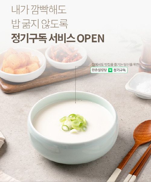 이연에프엔씨는 네이버 쇼핑 스마트스토어 한촌설렁탕 공식몰에서 국탕류 상온 간편식 정기구독 서비스를 진행한다고 1일 밝혔다. 정기 구독 서비스 대상 제품은 이연에프엔씨의 인기 간편식인 한우사골곰탕, 육개장, 미역국, 부대찌개 등 총 8종이다.