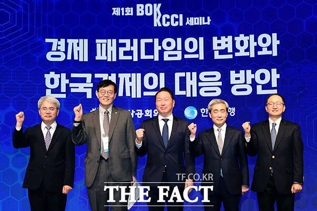 [더팩트ㅣ이선화 기자] 최태원 대한상공회의소 회장과 이창용 한국은행 총재 및 참석자들이 1일 오전 서울 중구 대한상공회의소 국제회의장에서 열린 제1회 BOK-KCCI 세미나 '경제 패러다임의 변화와 한국경제의 대응 방안'에 참석해 기념촬영을 하고 있다.