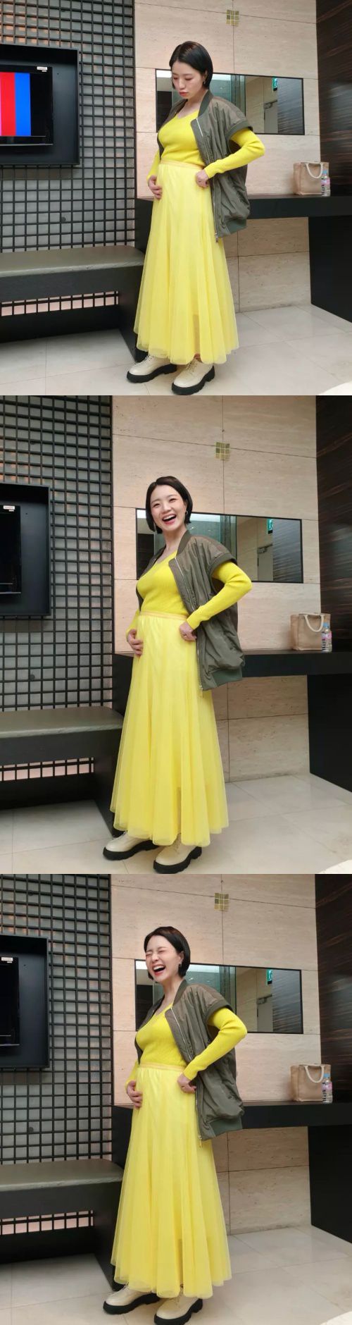 최근 임신 사실 공개 후 많은 축하를 받은 안영미는 “개나리곤듀쥐”라며 봄이 연상되는 샛노란 니트와 치마를 입고 볼록하게 나온 D라인을 드러냈다.