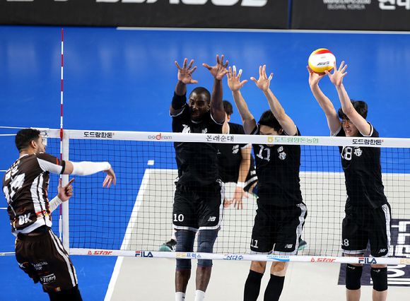 현대캐피탈 오레올(왼쪽에서 두 번째)가 1일 열린 OK금융그룹과 홈 경기 도중 상대 '주포' 레오가 때린 공을 블로킹으로 견제하고 있다. [사진=현대캐피탈 스카이워커스 배구단]