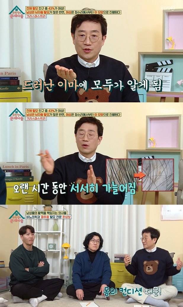 한상보는 탈모의 유전성에 대해 "남녀가 똑같다. 남자들은 이마 쪽으로 올라가니까 가릴 방법이 없다. 남성 탈모는 모낭이 죽어버려서 누가 봐도 탈모가 있는 것처럼 보이게 된다"라고 답했다.