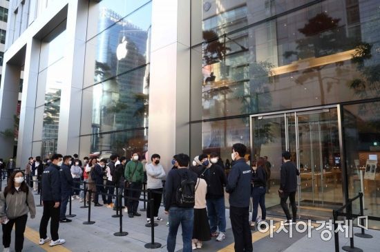 애플의 신제품 아이폰14 시리즈가 국내에 정식 출시된 지난해 10월7일 서울 중구 명동 애플스토어에서 시민들이 제품을 구매하기 위해 줄을 서고 있다.