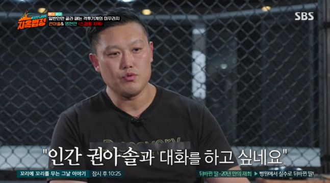 2일 방송된 SBS ‘이상한 나라의 지옥법정’에는 방송 말미에 로드FC 전 라이트급 챔피언 권아솔(36)과 MAX FC 전 헤비급 챔피언 명현만(37)의 스파링 장면이 전파를 탔다.