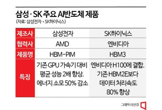 3일 업계 취재 결과 삼성전자와 SK하이닉스는 세계 최고 CPU(중앙처리장치)·GPU(그래픽처리장치) 기업인 미국 인텔, AMD, 엔비디아 등에 차세대 AI 메모리 반도체를 납품하는 중이다. 가장 눈에 띄는 제품은 삼성전자의 지능형 메모리(PIM) 반도체와 SK하이닉스의 고대역폭 메모리(HBM)3 반도체다.