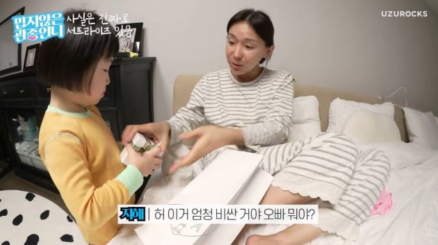 잠시 후 문재완은 딸을 시켜 몰래 이지혜에게 몰래 준비한 선물을 건넸다. 이지혜는 "이거 엄청 비싼 거다"며 깜짝 놀랐다. 문재완이 준비한 선물은 이지혜가 지난해 말한 럭셔리 주얼리 브랜드의 목걸이. 이지혜는 눈물을 글썽이며 감동을 감추지 못했다. 문재완은 "아까 분위기 너무 냉랭하던데 왜 이렇게 다르냐"며 웃었다. 이지혜는 "재밌게 하려고 그런거다"고 해명했다.