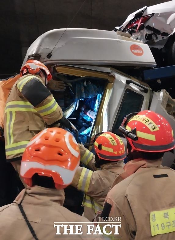 3일 경북소방본부 등에 따르면 이날 오전 0시 27분쯤 경주시 외동읍의 한 도로를 달리던 5t 화물차가 정차 중이던 차량 5대와 충돌하는 사고가 발생했다.