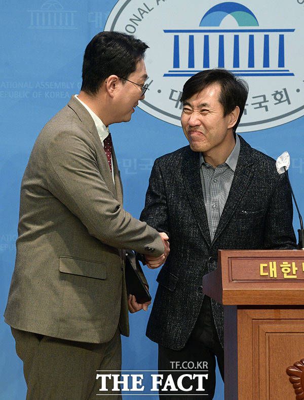 하태경 의원(오른쪽)이 당 대표 선거에 나선 천하람 당협위원장을 소개하고 있다. |