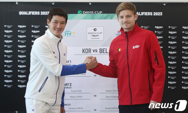 대한민국 권순우와 벨기에 다비드 고팽이 3일 오전 서울 송파구 올림픽공원 실내 테니스장에서 열린 2023 데이비스컵 예선 대진추첨식에서 기념촬영을 하고 있다. 2023.2.3/뉴스1 ⓒ News1 임세영 기자