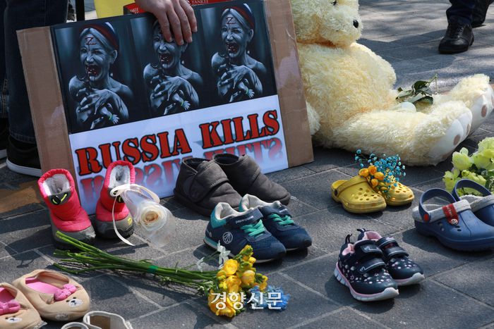 지난해 4월 서울 러시아대사관 부근에서 열린 재한 우크라이나인들의 러시아의 침공을 규탄하는 집회에 희생된 어린이들을 추모하는 의미의 어린이 신발이 놓여 있다. 우철훈 선임기자 |