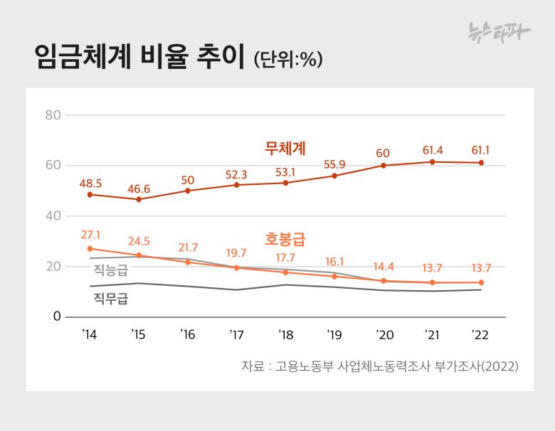 호봉제를 택한 기업의 비율은 대기업이 중소기업보다 높지만, 거꾸로 비정규직 노동자의 비율은 중소기업이 훨씬 높게 나타납니다. 앞선 보도에서 살펴본 것과 같이, 중소기업일수록 지불 능력이 떨어져서 저임금의 비정규직 노동자를 고용해 연명할 수밖에 없는 상태라고 보는 것이 더 타당한 해석일 것입니다.