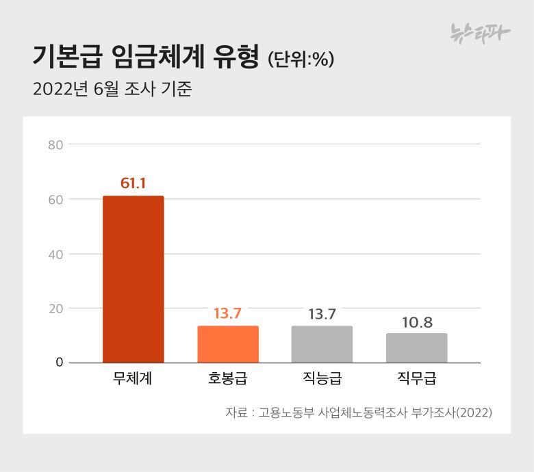 연공형 임금체계의 대표적인 사례는 호봉제입니다. 우리나라의 전체 사업체 164만 곳 가운데 호봉제를 적용하는 기업은 22만 곳으로 전체의 13.7% 수준입니다. 그런데 호봉제의 문제점을 논의하기 전에 먼저 따져봐야 할 것이 있습니다. 61.1%, 무려 95만 곳이 넘는 기업들은 아예 임금체계 자체를 가지고 있지 않은 상태라는 점입니다.